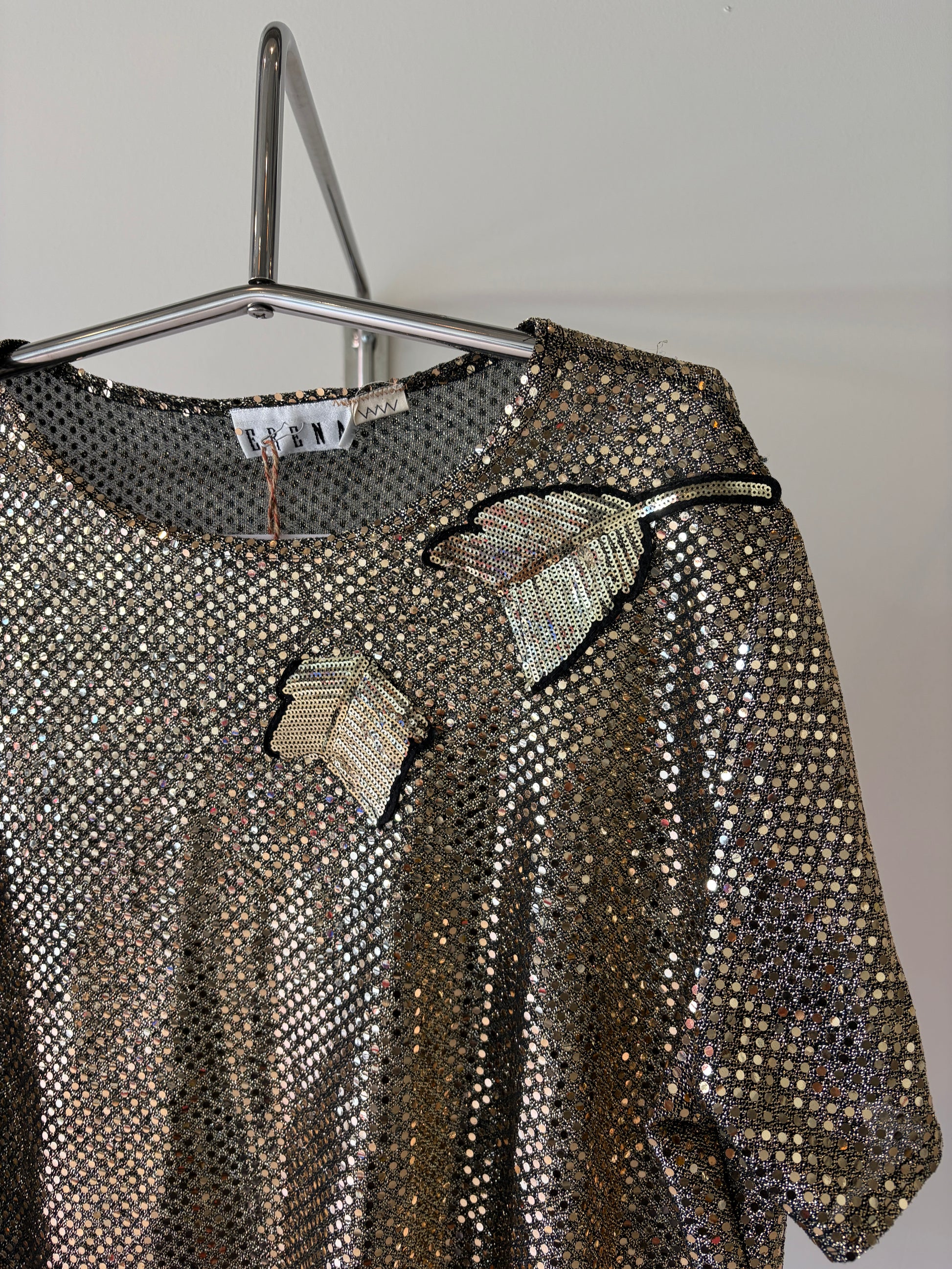 The silhouette remains relaxed, allowing the texture and intervention to carry the visual weight. Light moves across the surface unpredictably, catching on both the original sequins and the added details.
